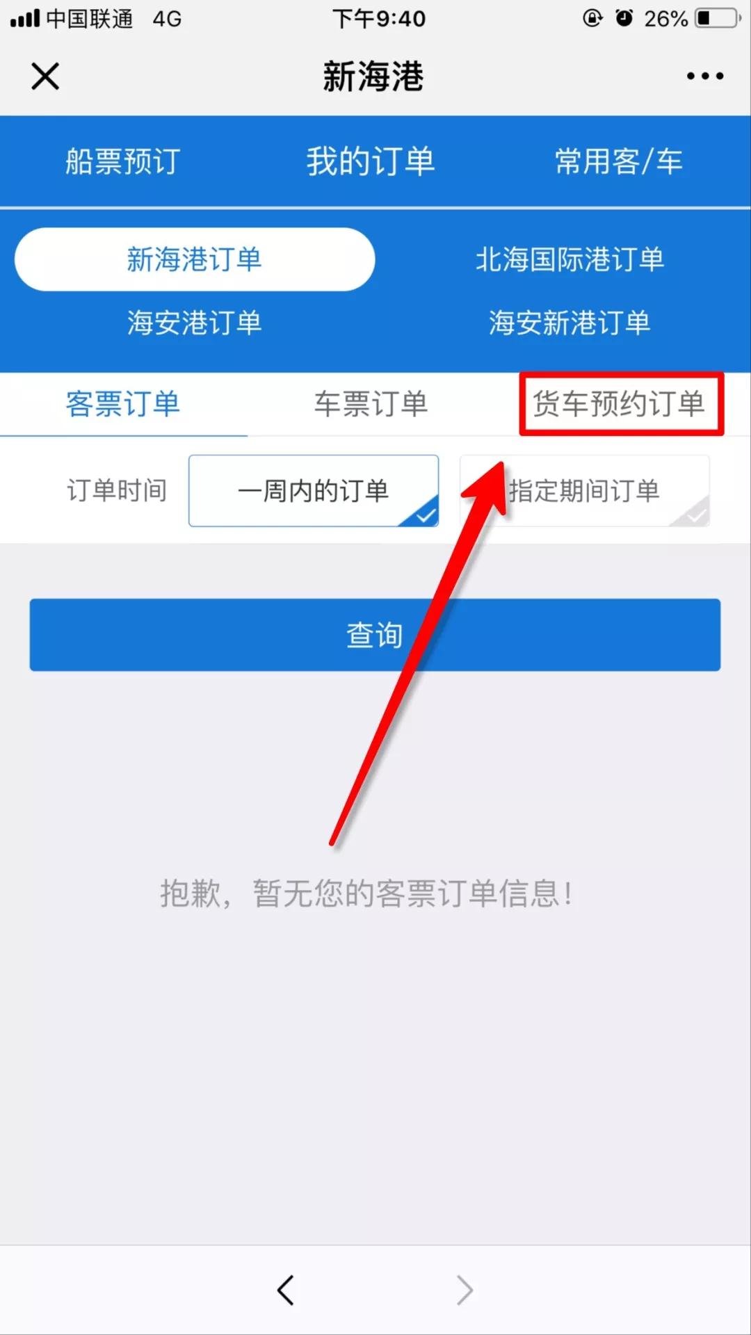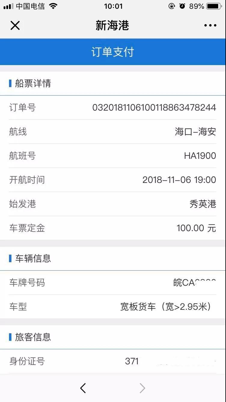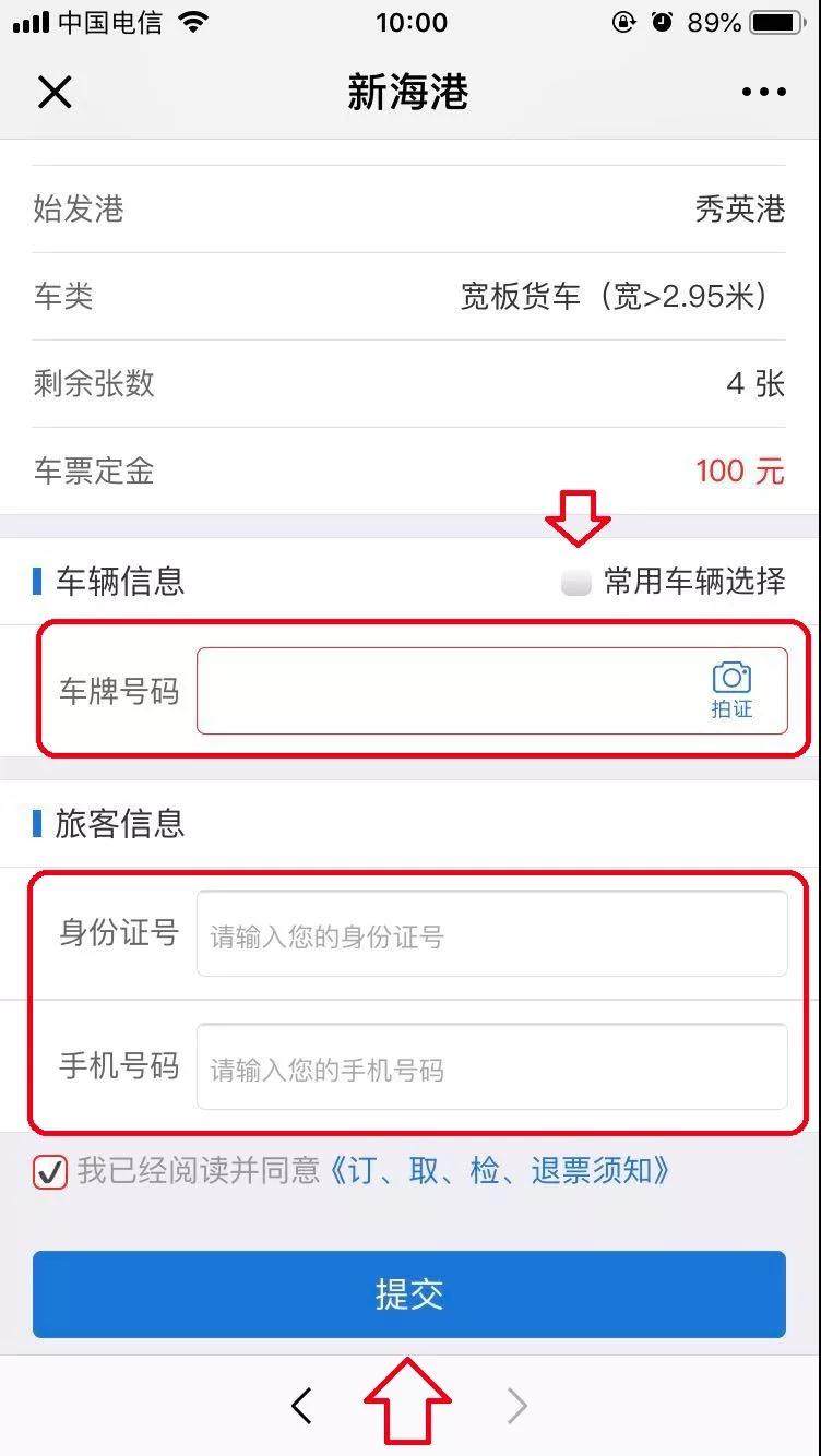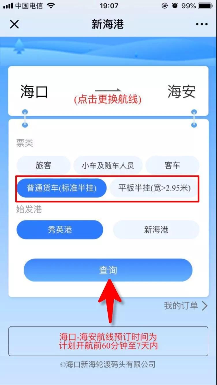 注意事項 1、進港時間為開航前180分鐘至45分鐘,開航前30分鐘停止檢票; 2、建議裝載貨物完成后或準備出發來港口時再辦理預約購票手續; 3、2018年11月8日-12月31日為試運行期間,2019年1月1日正式運行,正式運行后非預約車輛將引導出港; 4、預約金額為人民幣100元整,辦理相關購票手續后系統會自動將定金全額返還回原賬戶; 5、注意選擇貨車車型,以便港口核查并加快配載速度,避免耽誤登船時間; 6、一個車牌號一個身份證號一天內只能預約一個號; 7、購票時需出示身份證給售票員進行驗證是否預約,購票人員身份證需包含預約提交的人員身份證。 預約購票流程 1、選擇航線、車型和始發港 點擊“查詢” 2、選擇航班時間 3、填寫車牌號和旅客身份證號、手機號 預約過后系統會記住您的車牌號 再次預約可以使用“常用車輛”選項 4、訂單支付 再次確認預定信息無誤后點擊“支付” 5、訂單查詢 已付款訂單和未付款的訂單都可查詢