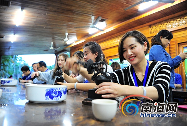 11月25日,“改革開放看海南”2018年全國融媒體海南行采訪團在興隆熱帶植物園體驗手磨咖啡。南海網記者沙曉峰攝