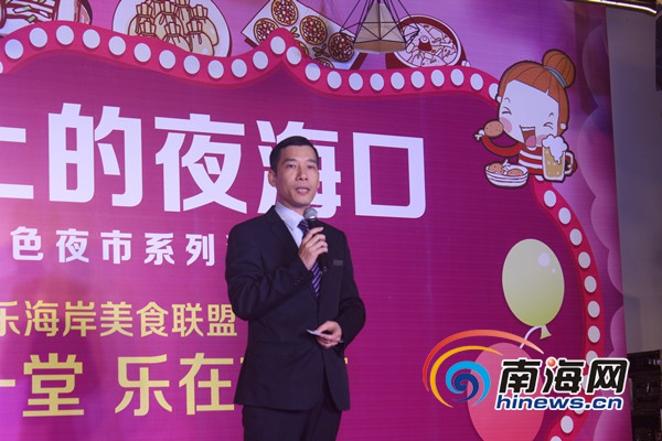 活動現場,歡樂海岸美食聯盟常務副總經理楊東華為現場觀眾推介歡樂海夜市。歡樂海岸美食聯盟是由海南新寶島餐飲管理有限公司傾力打造的,集特色餐飲、海洋產品深加工、原生態種養食材基地、漁業合作發展等多產業全新模式的連鎖品牌企業,于2015年9月26日開業,樓高6層,總建筑面積約35000平方米,設有海南家宴、潮汕家宴、海天一色、老廣州茶點、潮牛火鍋和宵夜大排檔等6大門店,各門店菜品風味各異,特色明顯。