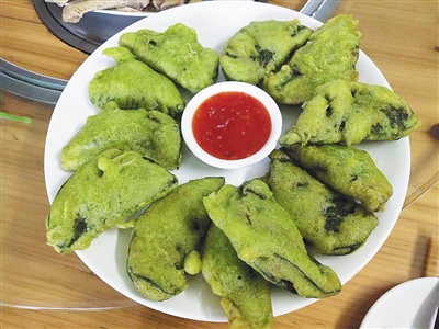 在五指山,還有一道用撈葉烹飪的別致菜肴——黎家綠葉寶,其中的綠葉就是指撈葉。黎家綠葉寶用豬肉做餡,撈葉包裹著肉餡,最外一層的面皮也是綠色的,這是撈葉汁和面粉混合的結果。這層面皮既能保證第二層的撈葉不變色,又能炸熟里面的肉餡。當裹上面糊的黎家綠葉寶,在油里炸得發了起來,一個個胖乎乎的,看上去特別誘人,撈起來后還得趁熱吃才香脆美味。在儋州中和鎮,也有類似于黎家綠葉寶這樣的吃法,只是名稱變成了撈葉肉卷,更為直接了當。喜歡不同口味的人們,還把肉卷的豬肉餡換成牛肉餡或者蝦滑,同樣美味。撈葉肉卷端上桌的時候,通常還會搭配一小碟泰式甜辣醬,蘸上點酸甜味,吃起來更可口,也不容易膩。