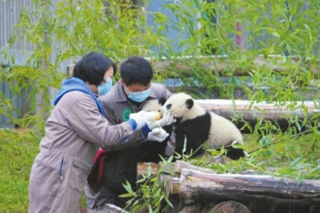 飼養員抱著“和和”“美美”。