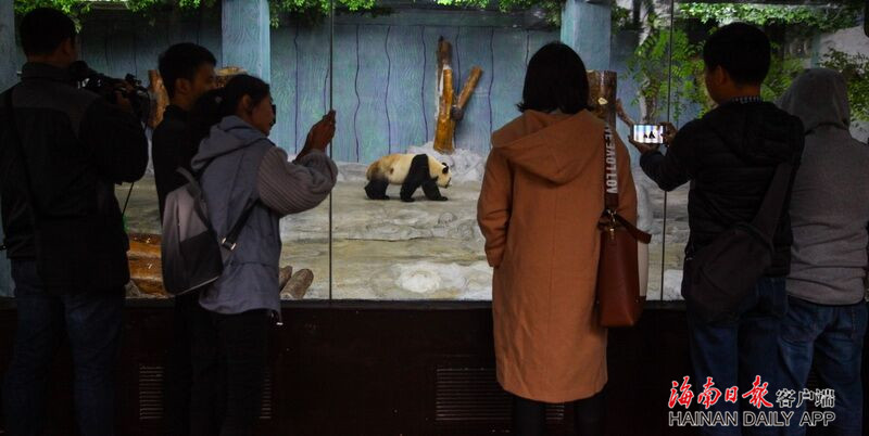 ↑市民前來(lái)觀看熊貓。 海南日?qǐng)?bào)記者 張茂 攝