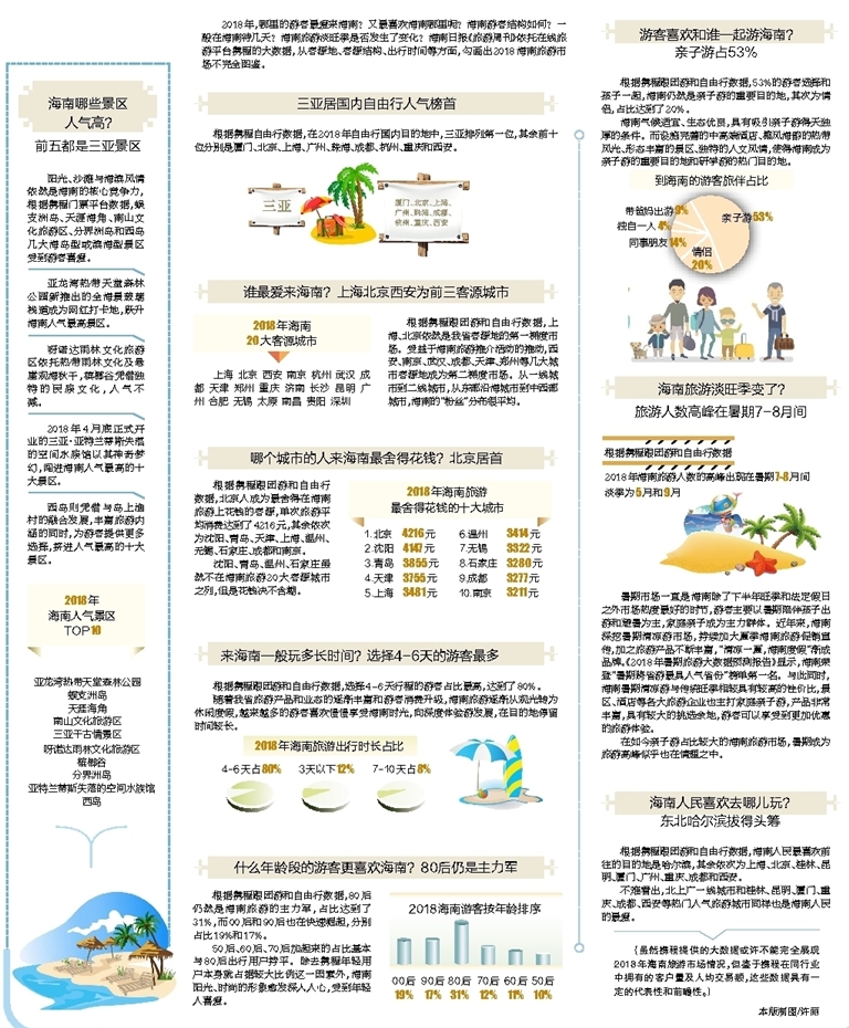 2018年,哪里的游客最愛來海南?又最喜歡海南哪里呢?海南游客結構如何?一般在海南待幾天?海南旅游淡旺季是否發生了變化?海南日報《旅游周刊》依托在線旅游平臺攜程的大數據,從客源地、客源結構、出行時間等方面,勾畫出2018海南旅游市場不完全圖鑒。