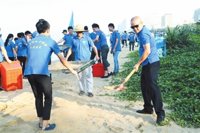 圖為益龍員工在三亞灣沙灘篩垃圾。