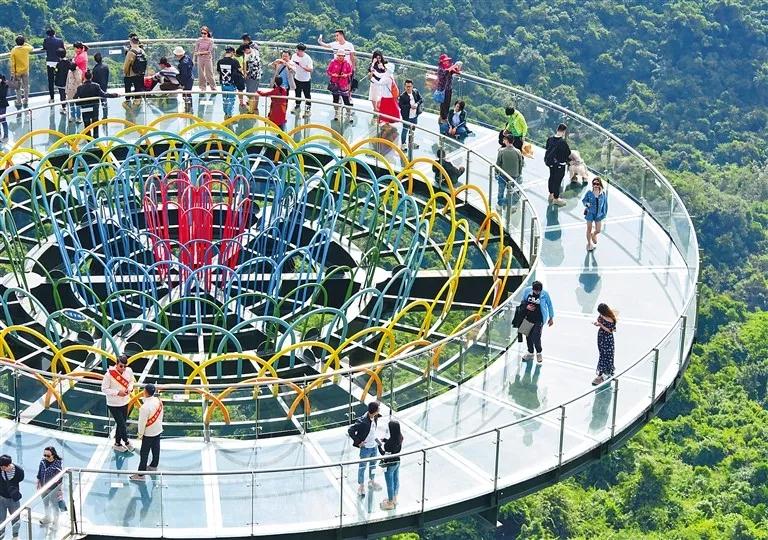 ↑游客在亞龍灣熱帶天堂森林旅游區(qū)全海景玻璃棧橋游覽。武威 攝