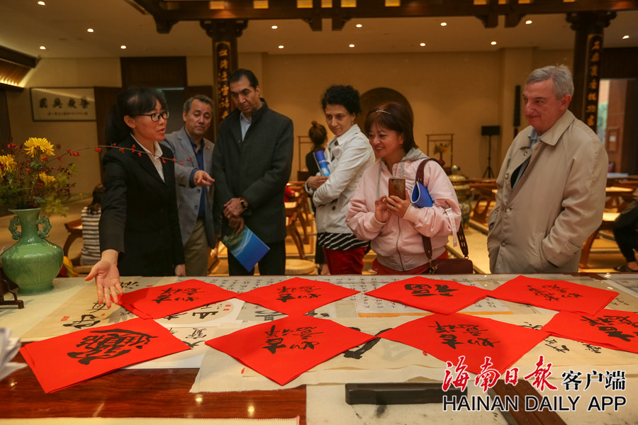 2019年1月17日,海南博鰲樂城國際醫療旅游先行區的博鰲一齡生命養護中心,來自斯里蘭卡、西班牙、斯洛文尼亞、保加利亞、斐濟等17國的駐華使節實地調研考察中國傳統文化——書法。海南日報記者袁琛 攝