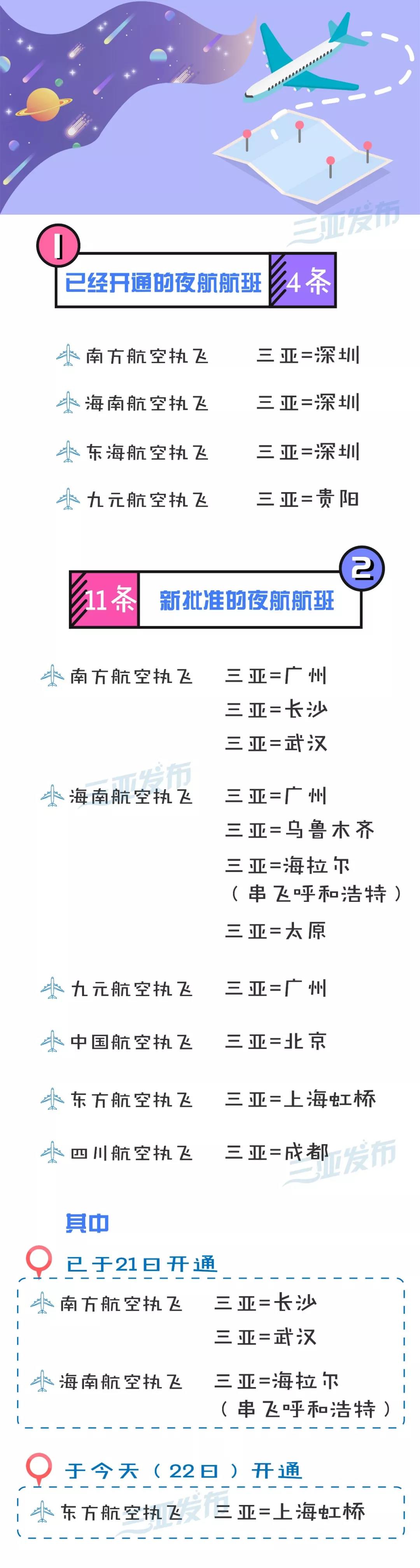 民航局批準(zhǔn)的11條加班航線包括海南航空4條,南方航空3條,中國航空、東方航空、四川航空、九元航空各1條。所有加班航線均為每天1班。春運(yùn)首日,三亞已開通3條加班航線,其余8條航線將陸續(xù)開通,加入三亞航空春運(yùn)保障,滿足春運(yùn)期間旅客進(jìn)出三亞需求。