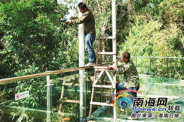 1月22日,三亞亞龍灣熱帶天堂森林旅游區,工作人員在全海景玻璃棧橋上維護檢修,確保春節期間景區安全有序。本報記者 武威 通訊員 黃慶優 攝