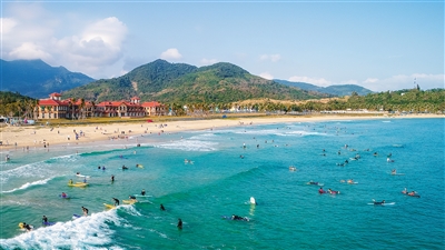 ?2月9日,萬寧日月灣,游客在大海中沖浪,享受假日時光。 本報記者 袁琛 攝