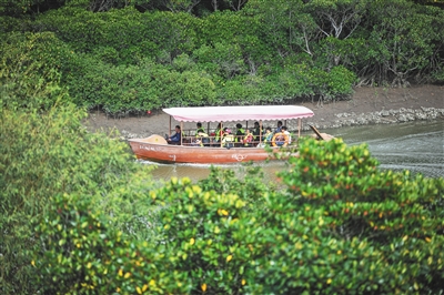 游客坐船游覽海口市東寨港紅樹林旅游區(qū)。 本報(bào)記者 袁琛 攝