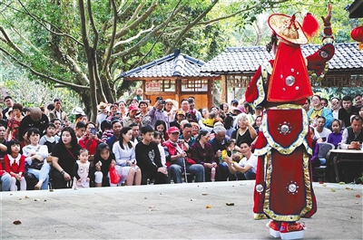 2月5日,市民游客在海口火山口地質(zhì)公園觀看瓊劇表演。 本報(bào)記者 張茂 通訊員 熊麗 攝