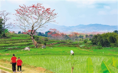 在昌江黎族自治縣木棉花觀景點之一的叉河鎮(zhèn)排岸村,大面積盛開的木棉花紅艷似火,地面上也掉落下不少,引得游人爭相拾取。而進入花期的木棉花和春耕的水田風(fēng)景相融合,加上面貌一新的美麗鄉(xiāng)村交相輝映,好一幅新時代的農(nóng)村風(fēng)景畫!