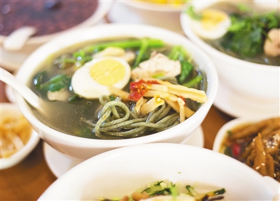市場上,琳瑯滿目的雞屎藤產品有許多,怎樣做出特色、做出創新,就成了她考慮的重點?!叭藗兂詵|西越來越講究健康。” 羊蓮菲說,受蔬菜面條的啟發,她想到了做雞屎藤面。經過反復實驗,她發現用曬干的雞屎藤和面,能很大程度上去掉雞屎藤的腥味。對于配料、高湯她也反復嘗試,達到售賣標準。
