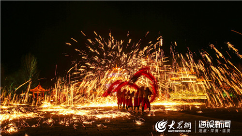 ?臺兒莊古城內非遺項目“火龍鋼花”表演