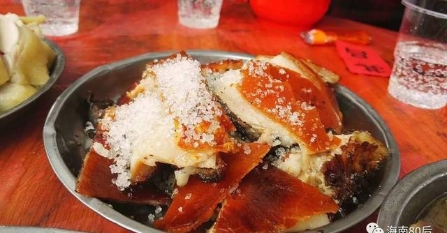 烤乳豬是海南本特罕見的菜肴,在許多結(jié)婚宴席上都能見到。而粉嫩的乳豬會(huì)灑些白糖,聽婚宴師父說這么搭配能夠增加清淡,吃起來爽口。