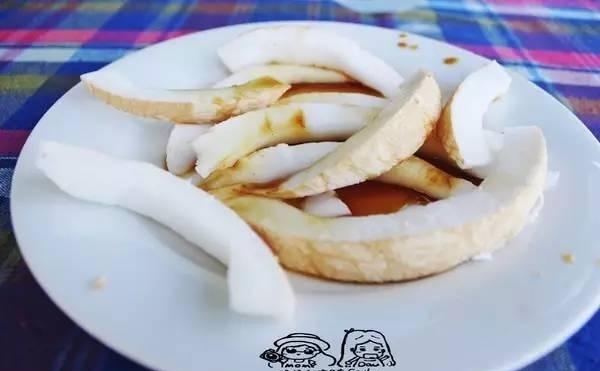 椰子配紅糖的服法在文昌占多數(shù),老椰子肉蘸點(diǎn)紅糖,甜甜的很有嚼勁。