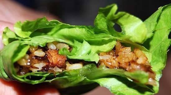 海南定安的菜包飯將五花肉、蝦米、香腸、魷魚、一年四季豆、芹菜、韭菜等與米飯混淆然后炒制,包在生菜中吃。