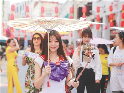 2月19日,參加??诼糜误w驗(yàn)活動的網(wǎng)紅主播在??隍T樓老街作在線旅游觀光直播。 本報(bào)記者 張茂 攝