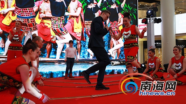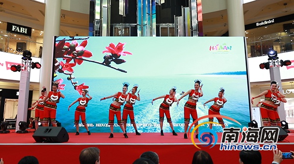 展會(huì)現(xiàn)場(chǎng),傳統(tǒng)舞蹈《久久不見(jiàn)久久見(jiàn)》、黎族特色舞蹈《三月三》、贈(zèng)送貝殼制作的海南特色禮品、竹竿舞互動(dòng)等獨(dú)具三亞特色的節(jié)目在莫斯科阿特里姆商業(yè)中心上演。