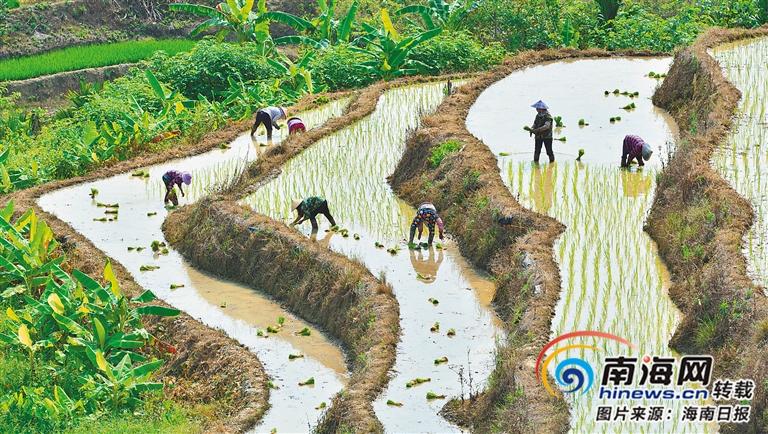 近日,五指山市毛陽鎮牙胡村的村民正在梯田里插秧,一派忙碌的春種景象。通訊員 尹輝 攝