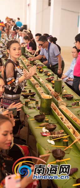 苗族婚俗展示結束后,南圣鎮還在新春村舉行了長桌宴,三色飯、五腳豬等五指山特色美食讓人垂涎欲滴,黎族苗族同胞組成的敬酒隊伍唱響了一首又一首好聽的民歌,將“三月三”節慶活動的氣氛推向了又一個高潮。