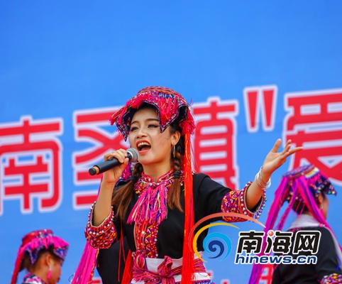 當天下午3點左右,南圣鎮的父老鄉親從四面八方匯聚至新春村文化廣場,精美的舞臺位居中央,各個村委會的村民圍繞著舞臺形成了一個半圓形的觀眾席,苗族歌手、新春村村民曾若馨和同伴首先為大家演唱了《久久不見久久見》這首耳熟能詳的海南民歌。