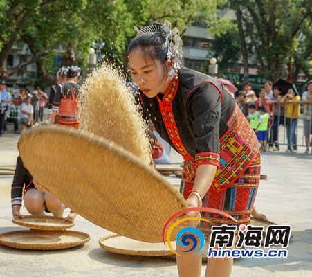 4月8日上午,五指山市在三月三廣場舉行舂米比賽,一位參賽選手正在篩米。南海網(wǎng)記者 葉子青 攝