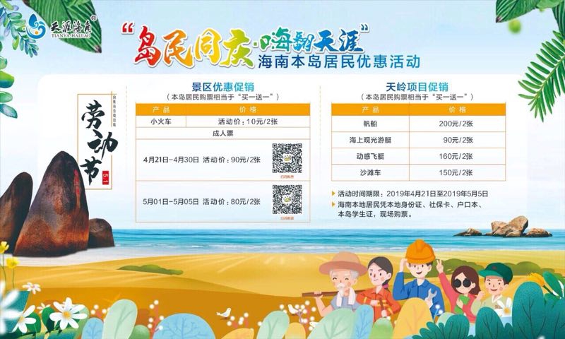 據(jù)介紹,2019年4月21日至5月5日期間,海南省本島居民憑有效證件(海南本地居民身份證、社保卡、本島學生證),即可在指定平臺享受“買一送一”的購票優(yōu)惠,優(yōu)惠項目包括景區(qū)門票、觀光小火車、帆船、動感飛艇、海上觀光游艇等。特別是,5月1日至5月3日,通過美團、同程OTA平臺購買景區(qū)門票還可享秒殺優(yōu)惠,即19.9元/張,每天限15張。好機會不容錯過,市民游客在“五一”期間用一個人的游玩價格,即可收獲雙人游玩的美好時光!