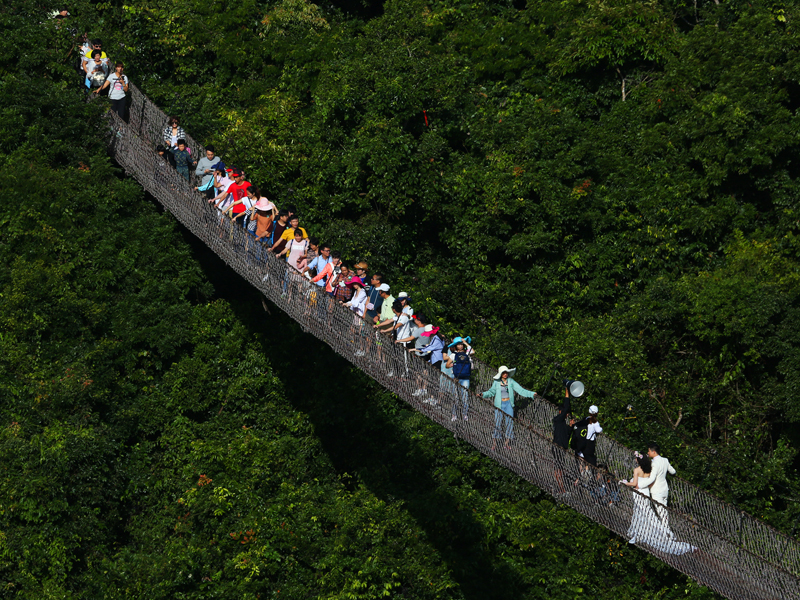 圖為中外游客暢游亞龍灣熱帶天堂森林旅游區的景象。(黃慶優攝)
