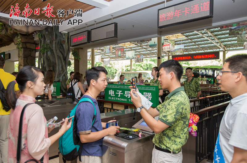 記者在呀諾達雨林文化旅游區(qū)和檳榔谷黎苗文化旅游區(qū)看到,為了讓游客快捷入園,兩家景區(qū)在入園檢票口提前設(shè)立了“海南旅游年卡專用通道”,并有專人專崗服務(wù)。工作人員手持人臉識別POS機,只需掃碼和刷臉兩個步驟,游客幾秒鐘就可入園,比起現(xiàn)場排隊入園的游客堪稱神速。
