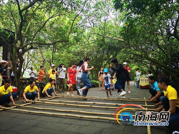 馮塘綠園內游客體驗竹竿舞。南海網記者 蘇靚 攝