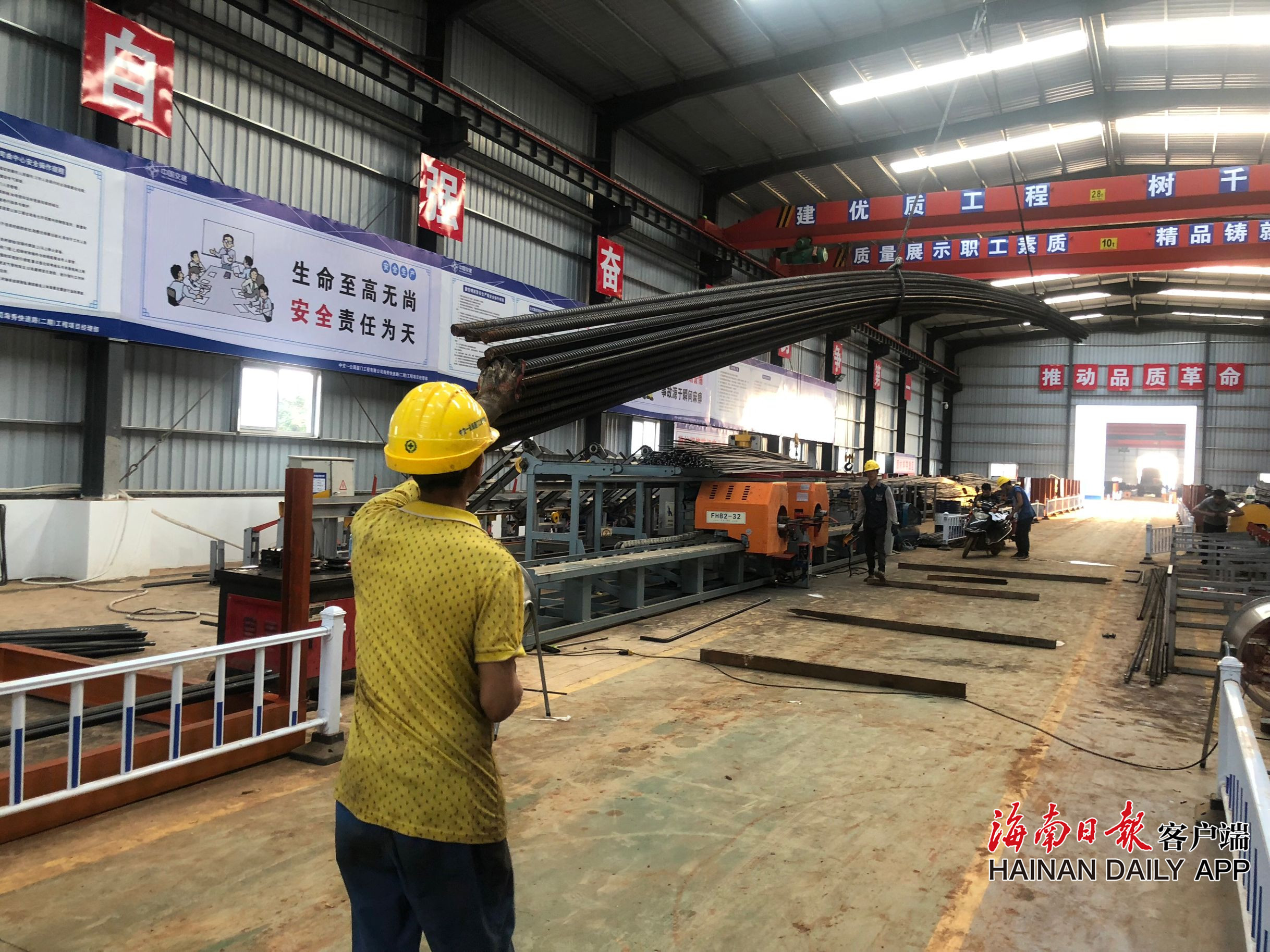 此時雖已是下班時間,然而工地現(xiàn)場依然是一幅熱鬧景象。記者看到,鋼筋加工廠棚內,工人正操作著機械完成鋼筋切割、彎曲等加工工序,加工好的鋼筋被運送至各個橋梁墩身旁,由汽車吊吊至頂部交由工人綁扎,4、5個工人一天可以綁扎完一個墩身。