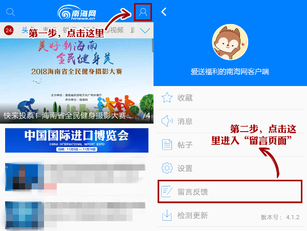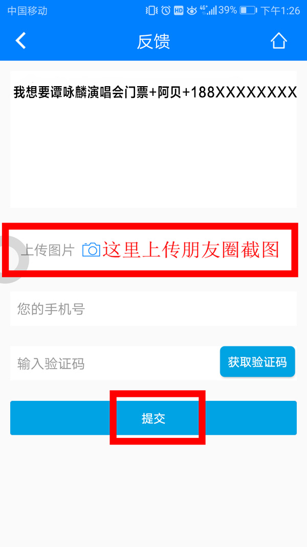 第二步:打開南海網客戶端,點擊右上角,進入留言反饋頁面填寫:“譚詠麟演唱會門票+姓名+電話”(舉例:譚詠麟演唱會門票+阿貝+188XXXXXXXX),并將朋友圈分享截圖上傳,提交后即可成功參與活動!