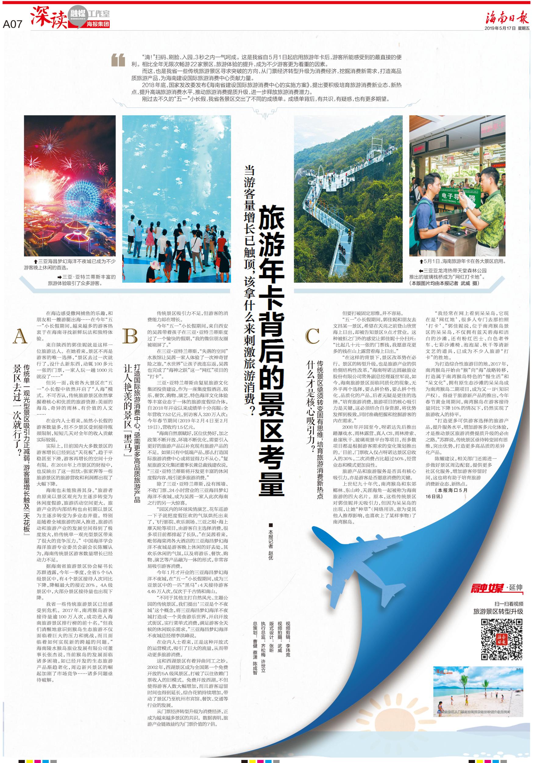 編者按:5月17日出版的《海南日報》深讀欄目推出《當游客量增長已觸頂,該拿什么來刺激旅游消費?旅游年卡背后的景區考量》一文,我省自5月1日起啟用旅游年卡后,游客感受到了最直接的便利。從門票經濟轉型升級為消費經濟,挖掘消費新需求,打造高品質旅游產品,也為海南建設國際旅游消費中心貢獻了力量。