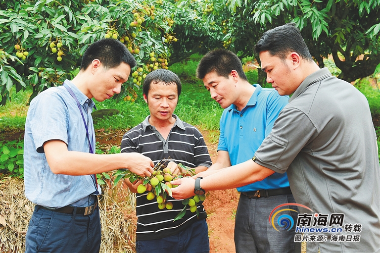 敦茶村鄉村振興工作隊隊員在荔枝園了解情況。海南日報記者 蘇曉杰 通訊員 王家專 攝