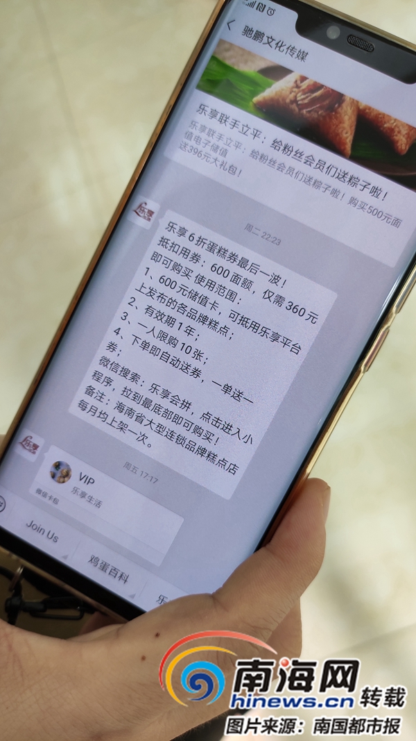 南國都市報5月19日訊(記者 王康景 文/圖)??谝还就ㄟ^“樂享團購”活動,發(fā)展線下“團長”吸引群眾“入群”參與各類優(yōu)惠卡團購活動,包括加油卡、超市購物卡、糕點店卡、水果品牌連鎖店購物卡等等,按照6折至9折不等的優(yōu)惠出售給“團員”。然而,很多人付款后發(fā)現(xiàn),公司不及時發(fā)卡,或者所發(fā)卡并無金額。19日,??诓簧賲⒓訄F購優(yōu)惠卡的市民向公安機關投訴海南馳鵬文化傳媒公司涉嫌欺詐和非法集資,所涉金額數(shù)百萬元。目前,事件還在進一步調(diào)查中。