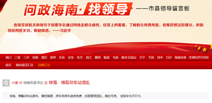 ↑↑網友在南海網“問政海南·找領導”欄目的留言截圖