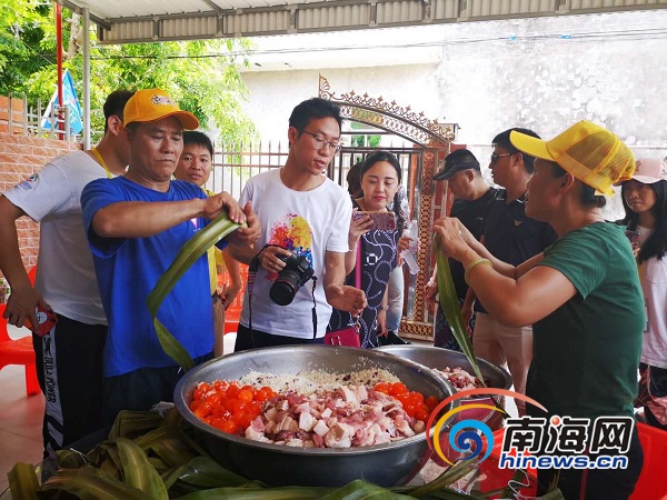 樂東不僅有“銀山”,還有包裝獨特的粽子。卷粽葉、加餡料、綁細線、包粽子……在鶯歌海鎮,村民們在為即將舉辦的媽祖文化節準備1000個粽子,讓游客提前感受端午佳節之樂。與常見的粽子不同,樂東的粽子是用菠蘿葉捆成長條,粽子里有瑤柱、蜜豆、蛋黃和肥瘦相間的豬肉,食材豐富令人垂涎三尺。