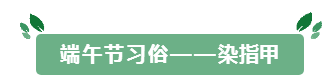 在定安、瓊中等部分市縣,端午節會給女孩子染指甲。把指甲花搗碎,放在指甲上,再用特有的葉子包住,用包粽子的麻繩綁好。關于端午染指甲,還有著這樣一句俗語“五月端午染指甲,蝎子蟲子不咬娃”。