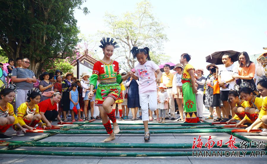游客在三亞市南山文化旅游區跳竹竿舞。 據海南日報客戶端|記者 袁琛 特約記者 陳文武 攝影報道