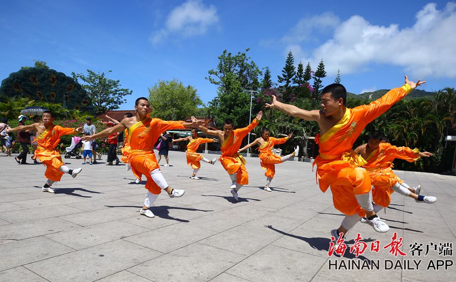 6月8日,“小武僧”在三亞南山文化旅游區給游人表演功夫套路。 據海南日報客戶端|記者 袁琛 特約記者 陳文武 攝影報道