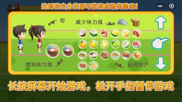 游戲操作可以說是簡單至極,用一根手指就能玩。玩家只需要把手指按在屏幕上,游戲角色就會開始向前奔跑,玩家需要向上、向下劃動手指操縱角色,沿途拾撿補給品或閃避障礙物,手指離開屏幕時游戲就會暫停,不用擔心游戲玩到緊要關頭時突然被打斷。隨著玩家深入“景點”,游戲角色的奔跑速度會越來越快,玩家能在海南各大景點中感受到讓人腎上腺素飆升的“速度與激情”。
