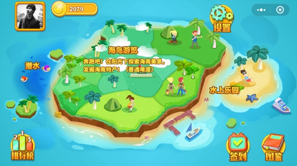 一進入游戲主界面,披滿綠茵的海南島便出現在玩家面前,主界面分為“海島游覽”“水上樂園”“潛水”等三大區(qū)域,每個區(qū)域都包含海南的標志性景點或娛樂項目,玩家選擇進入景點即可進入游戲。