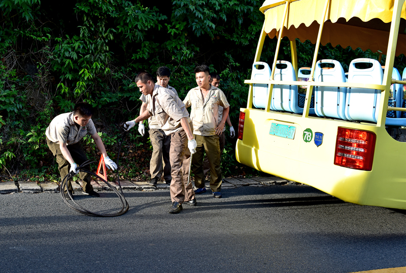 此外,29日下午,在景區西線景觀公路美麗梧桐站90度大拐彎處,有一輛游覽車因拐彎“失控”方向打不過來,直接“撞上”路邊的護欄上,當場有幾位“游客受傷”,情況非常緊急!當事司機立即用手機撥打景區救援電話,不到5分鐘的時間,景區救援隊和醫務人員及時趕到“事發”現場,展開緊張的“救援”工作。在現場看到,景區員工用擔架將“受傷”的游客抬到安全地段,景區醫務人員及時為“受傷”的“游客”進行“心肺復蘇”、“人工呼吸”、“傷口包扎”等,并將受“重傷”的“游客”立即送往“醫院”進行急救。