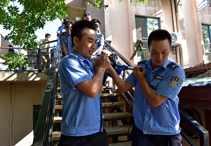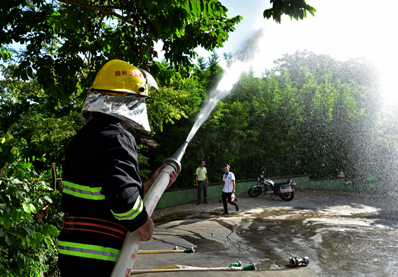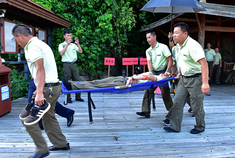 “火災”發生后不到幾分鐘,景區安保部五位專業消防員,身穿消防服、頭戴消防帽、全副武裝的乘坐水罐消防車及時趕到“火災”現場進行“滅火”。在現場看到,兩位員工在周邊拉起了警戒線,防止無關人員進入火場;景區醫務人員在現場展開救援工作,為“受傷”的客人及員工進行“包扎”等。在“火災”現場看到,景區員工們有條不紊地進行消防滅火、疏散員工、火場警戒和現場救援等應急處置工作。