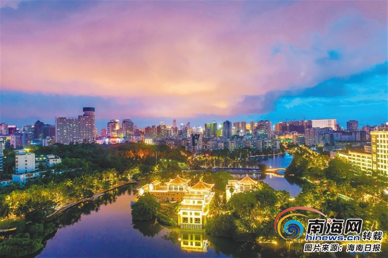 7月1日傍晚時分,高空俯瞰經(jīng)過全新升級改造后的海口東湖湖心島靚麗夜景。