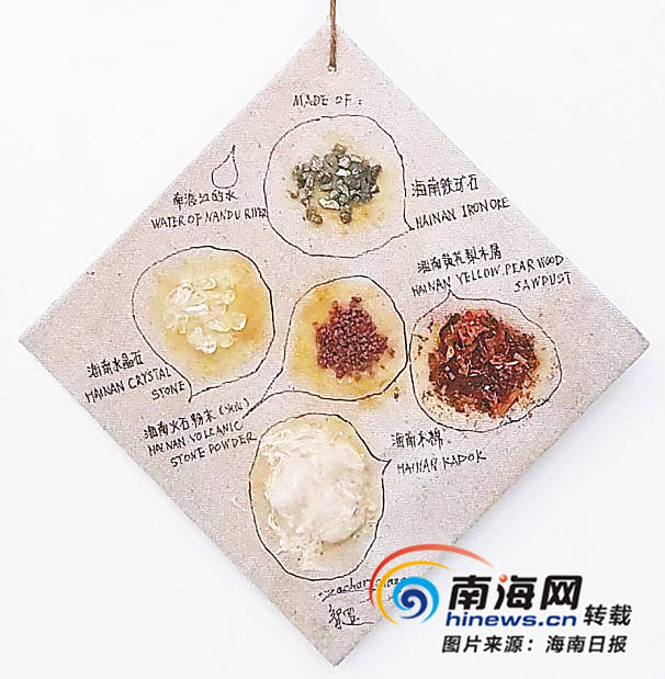 作為張智罡的第二故鄉,海南經常會在不經意間給予藝術家新的思考和藝術的靈感,本次雙年展展出的《聚散的五行》就是以海南石碌的鐵礦石、昌江的木棉、屯昌的水晶、五指山的黃花梨木屑、火山口的火山石粉末等帶有海南本土地域特征的材料,制作而成一幅表現海南印象的抽象作品,在威尼斯雙年展發出海南藝術之聲。