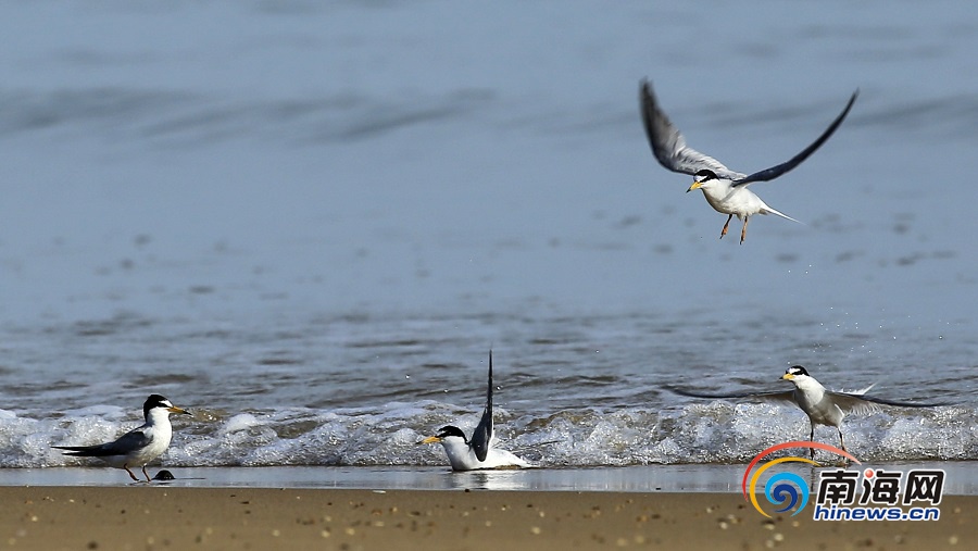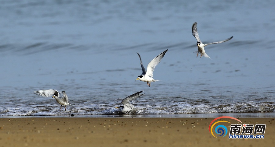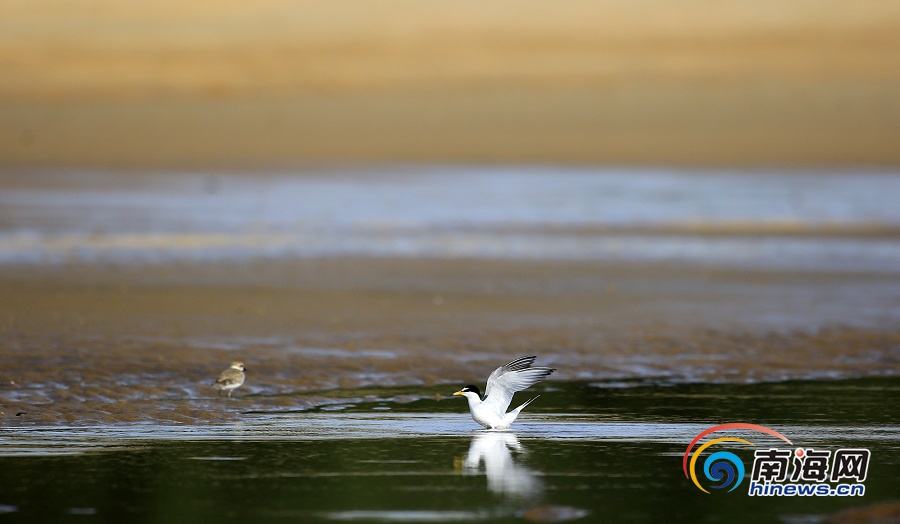7月11日,在海口五源河國家濕地公園,成群結隊的白額燕鷗在海灘上棲息覓食。海報集團全媒體中心記者 陳元才 攝