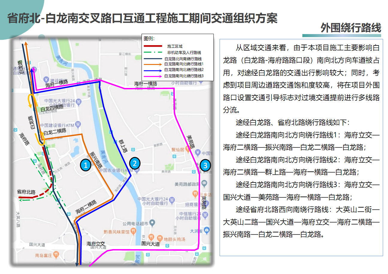 繞行路線1:海府立交—海府二橫路—振興南路—白龍南二橫路—白龍南路;