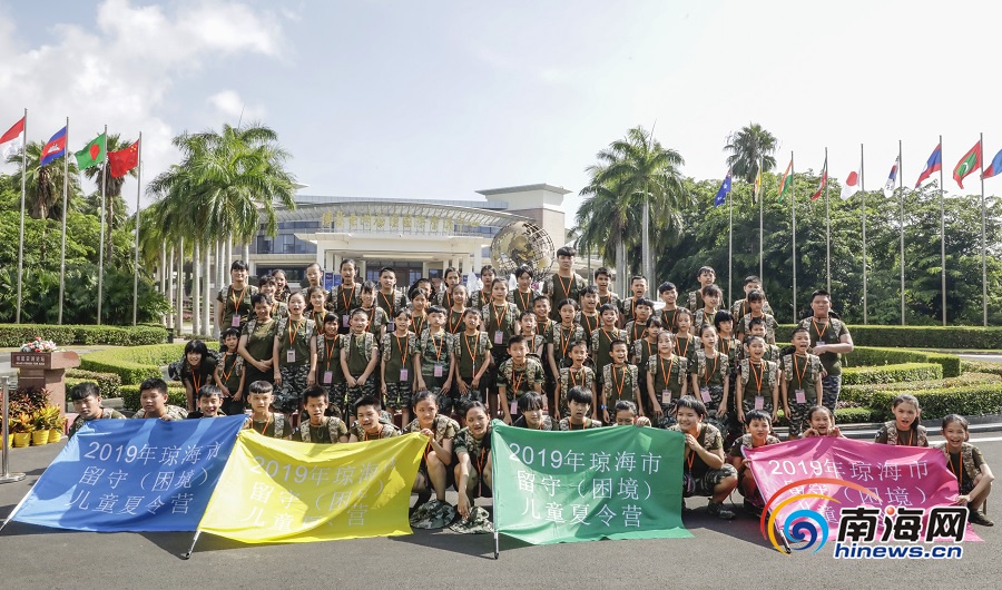 2019年瓊海市留守(困境)兒童夏令營(yíng)參營(yíng)小學(xué)員在博鰲亞洲論壇會(huì)址前合影留念。南海網(wǎng)記者 李昊 攝